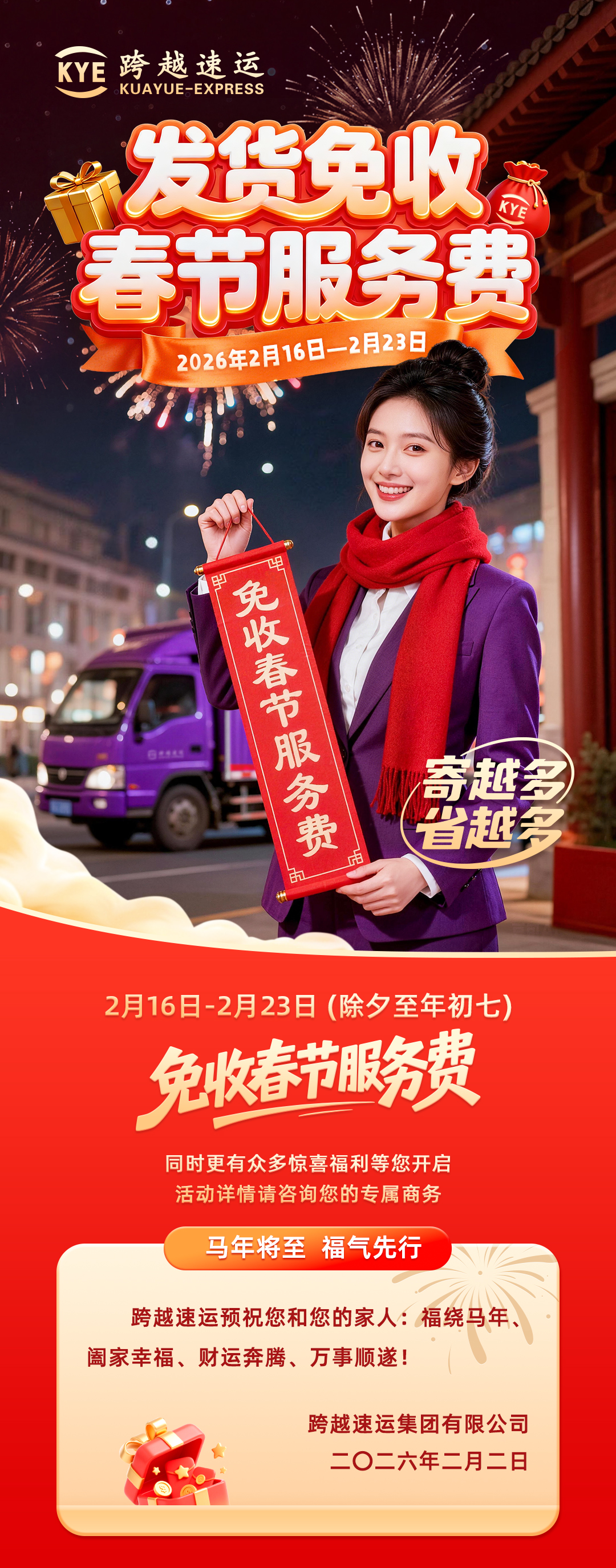 跨越速运以科技夯实快运物流服务根基,用精细化运营适配多样寄递需求,用实力打破行业服务瓶颈。值此马年春节来临,特推出发货双重礼:2026年2月16日至2月23日(除夕至年初七)免收春节服务费,同时提供专属寄件福利,详情可咨询商务对接人员。这份诚意举措,尽显其在快运物流领域的服务担当。