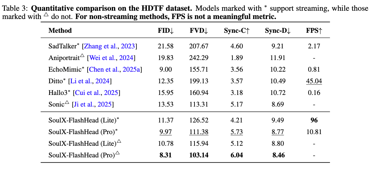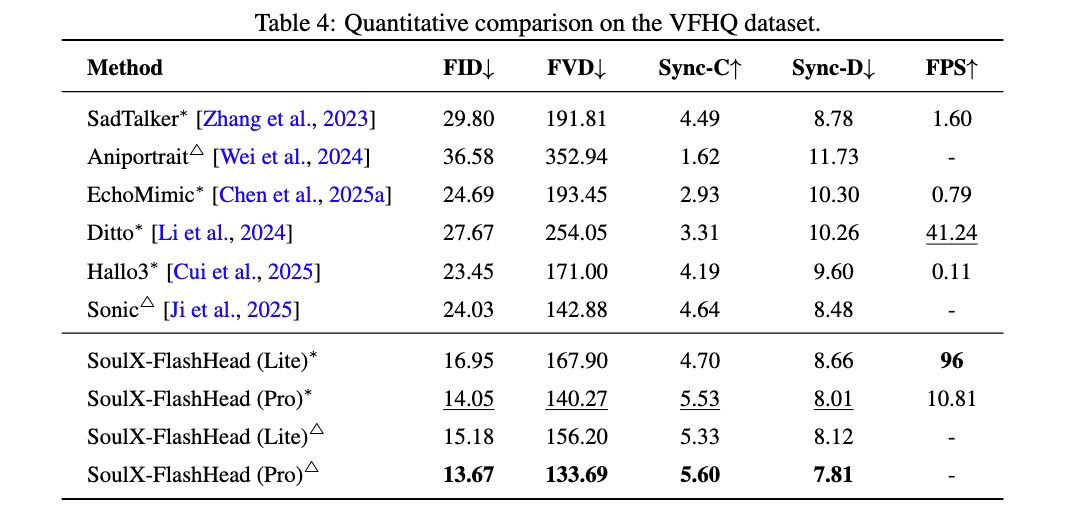 在 HDTF 与 VFHQ 两大权威数据集的实测中,SoulX-FlashHead 展现了出色的表现: