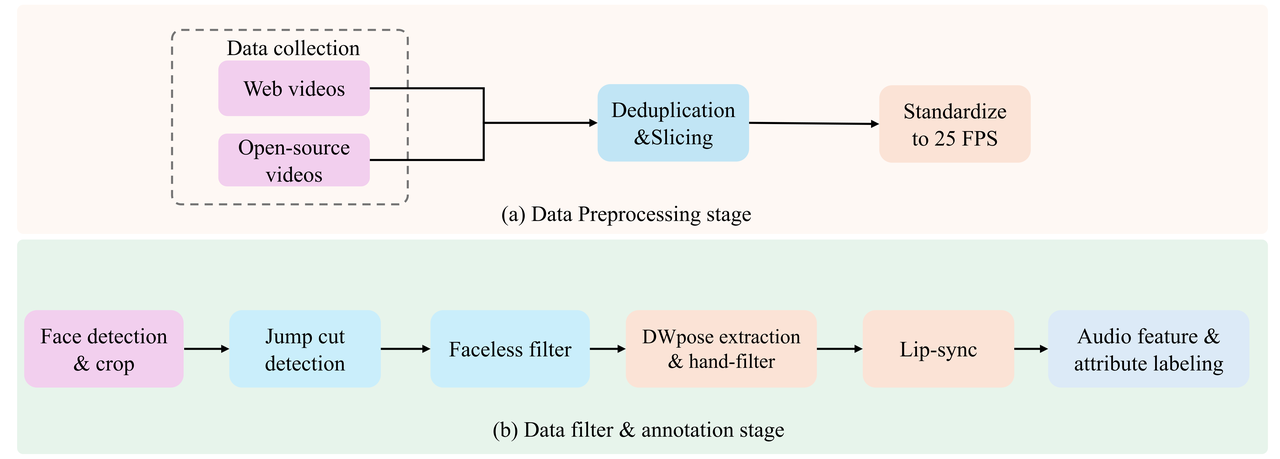 严苛筛选: 经过切分、DWpose 关键点、唇形一致分数过滤等多个处理步骤,为模型提供了最纯净的“养料”。