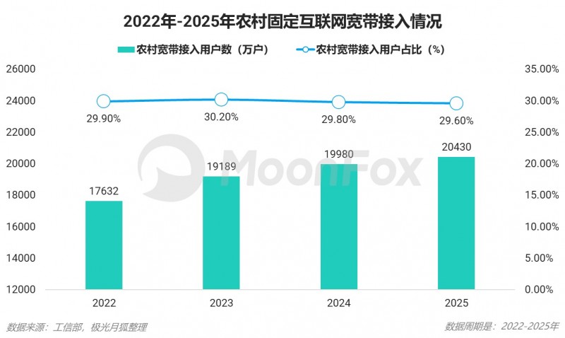而固定互联网宽带接入服务持续在农村地区加快普及,截至2025年底,全国农村宽带用户总数达2.04亿户,全年净增450.7万户。