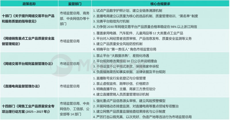 政策共同构建起覆盖生产、销售、售后全链条的电商监管体系,旨在提升网售产品质量合格率,规范平台与直播电商经营行为,切实保护消费者与中小商家合法权益,推动电商行业向合规化、高质量方向发展。