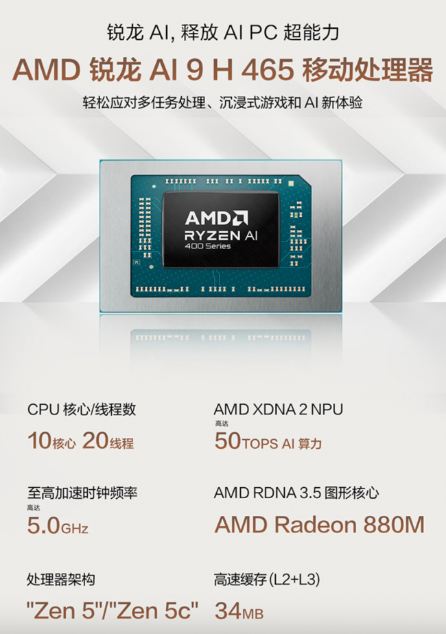 处理器方面,灵耀16 Air 2026配备AMD锐龙AI 9 H 465移动处理器,基于“Zen 5”/“Zen 5c”CPU架构,拥有10核心20线程设计,最高主频可达5.0GHz。内置AMD Radeon 880M核显、AMD XDNA 2 NPU,图形处理能力出色,并以至高50 TOPS NPU AI算力释放超能力,轻松应对多任务处理、沉浸式游戏和AIGC创作体验。并支持Windows 11 AI+PC功能,提供实时字幕、回顾(预览版)、增强版Windows搜索、单击以执行等多种实用功能,让高效渗透进每个高频办公场景,如跨国远程沟通、团队协作等。