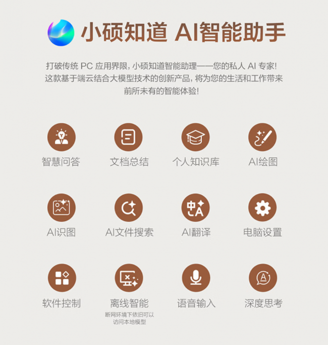 搭配内置的“小硕知道”AI智能助手,基于端云结合大模型技术,支持断网使用并提供智慧问答、文档总结、AI绘图、AI识图、AI文件搜索、AI翻译、电脑设置、软件控制等功能,满足文案撰写、创意辅助、系统控制等用机场景,凭借全场景适配能力助力摆脱琐碎事务,专注核心工作与价值创造。