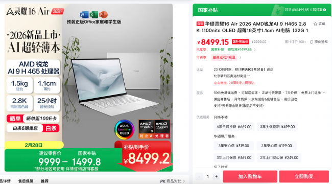 华硕灵耀16 Air 2026是职场人士轻装上阵的非常好的搭档,不止轻薄,还凭借强劲性能和卓越AI体验,助力在全新的事业征程中智胜未来。当前购机,不仅可享晒单返100E卡、白条6期免息福利,部分地区还可叠加至高1499.8元国家补贴,到手8499.2元。心动的小伙伴们可以点击下方链接或者上京东商城搜索#灵耀16 Air 2026#,获取更多产品细节。