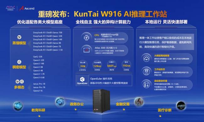 KunTai W916 AI推理工作站是基于华为“鲲鹏+昇腾”技术路线打造的塔式高性能AI工作站,聚焦全行业对高效边端推理能力的迫切需求,以性能强大、运行稳定的紧凑型算力一体机为硬件基础,围绕DeepSeek/Qwen等大模型打造多样化、矩阵化的应用软件,可广泛应用于交通、政务、医疗等应用领域,显著提升各行业工作流程的效率。