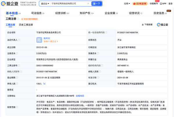 爱企查App显示,缸鸭狗品牌关联公司——宁波市缸鸭狗食品有限公司成立于2012年1月,注册资本2000万元,由宁波缸鸭狗投资股份有限公司全资持股,经营范围包括食品生产、食品销售等许可项目。作品著作权信息显示,宁波市缸鸭狗食品有限公司目前已登记包括宁波汤圆在内的6项作品著作。