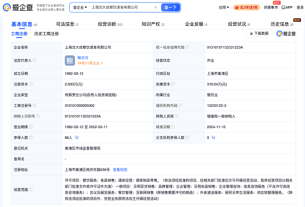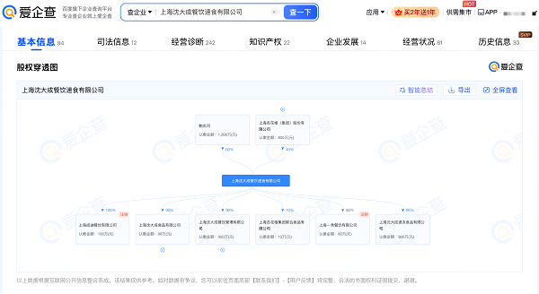 爱企查App显示,沈大成品牌关联公司——上海沈大成餐饮速食有限公司成立于1982年3月,注册资本2000万元,法定代表人为鲍忠河。其由法定代表人鲍忠河与上海杏花楼(集团)股份有限公司分别持股,持股比例为60%与40%。对外投资信息显示,该公司对外投资企业中超半数为开业状态。