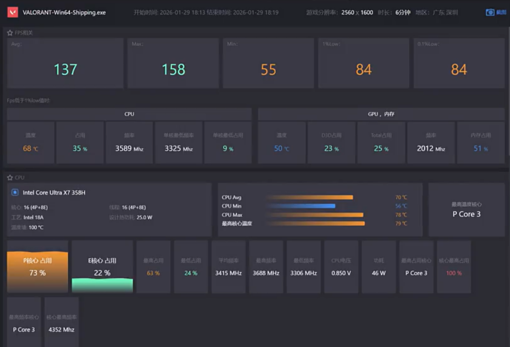 基准测试的优势并非纸上谈兵,实际游戏数据进一步印证了英特尔锐炫intel Arc B390核显的强悍实力。在《英雄联盟》2.5K分辨率高画质下,华硕无畏Pro16酷睿版平均帧率达到203帧,1% Low帧为136帧;《无畏契约》2.5K高画质下,平均帧率稳定在137帧,1% Low帧为84帧。流畅的运行表现确保了电竞级体验。