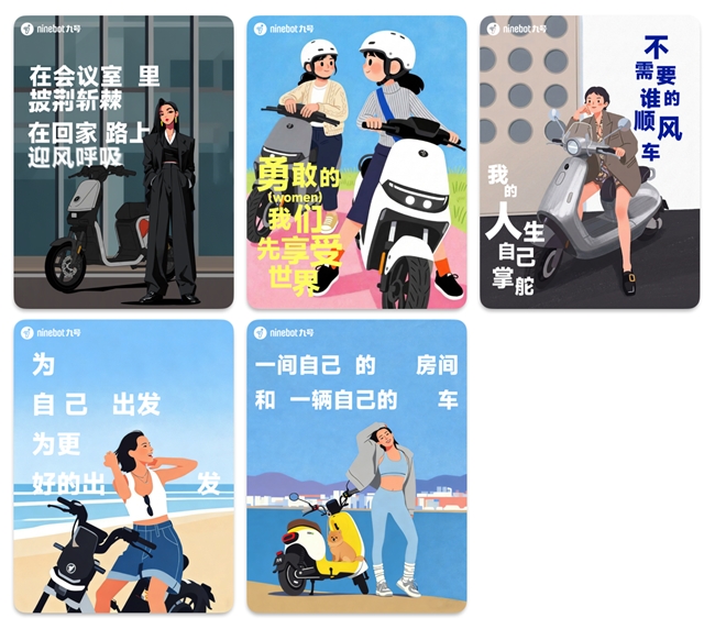 最近一组围绕女性骑行场景发布的品牌海报中,九号将镜头对准了不同身份的女性用户:她们是会议室里忙碌的职场人,也是海边骑行的自由探索者;是带着宠物出门的生活家,也是并肩同行的朋友。不同生活方式的背后,折射的是女性用户日益多元的出行需求。