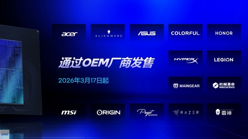 面市时间:搭载英特尔酷睿 Ultra 200HX Plus的系统将于2026年3月17日起由OEM合作伙伴陆续推出。详情可咨询相关厂商,合作伙伴系统包括并不限于:宏碁、华硕、七彩虹、戴尔、荣耀、惠普、联想、MAINGEAR、机械革命、微星、Origin、Puget、雷蛇、雷神。