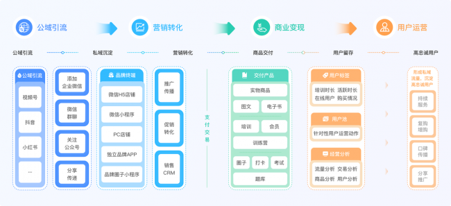 公私域全域获客:打通抖音、小红书、视频号、公众号等公域平台,支持商品挂载与引流;同时提供渠道活码、企业微信添加等工具,快速将公域流量沉淀至私域。