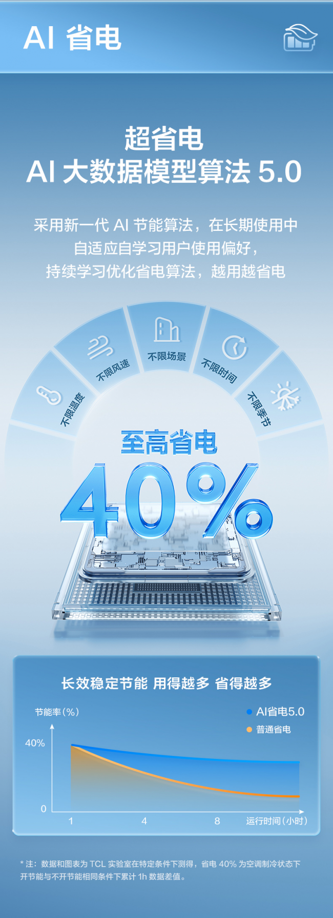 在AI省电方面,TCL小蓝翼·全域风Pro AI健康舒适空调搭载了升级的超省电AI大数据模型算法5.0,采用新一代AI节能算法,在长期使用中自适应自学习用户使用偏好,持续学习优化省电算法,越用越省电,至高省电40%。