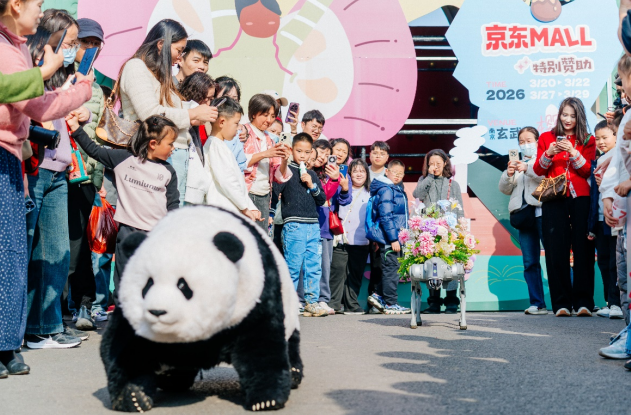 作为本次活动的特别赞助商,京东MALL以“不换房焕新家”为主题,在樱洲打造沉浸式AI智能生活快闪店,搭建可感、可触、可互动的未来家体验空间。让市民在赏花赏景之余,零距离感受智能家居带来的松弛生活。京东MALL还联动京东智能机器人业务部门,带来央视春晚舞台上惊艳全国的魔法原子机器熊猫。作为京东MALL快闪店的重磅“明星”,它在玄武门一亮相便吸引了游客围观,成为当之无愧的流量担当。圆滚滚的熊猫造型憨态可掬,时而跳舞卖萌,时而站立打招呼,引得大人小孩纷纷驻足围观,拍照合影。