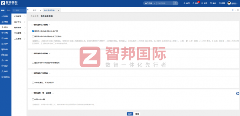 在产品与研发管理方面,智邦国际一体化ERP系统针对电子行业产品种类多、迭代快、编码不统一的痛点,构建了标准化、规范化的产品管理体系,实现产品信息的集中管控。系统支持统一产品编码设置,可灵活适配电子行业复杂的产品规格与型号,实现产品分类、单位、有效期、批号、序列号等信息的一站式管理,同时支持自定义设置产品参数,满足企业个性化管理需求。针对研发环节的痛点,系统实现了产品研发与生产、采购等环节的协同联动,支持物料清单(BOM)的无限层级设置与批量导入,变更过程详细记录,确保研发数据的准确性与可追溯性,减少重复设计,缩短研发周期,助力企业快速响应市场需求,提升产品创新能力。此外,系统支持产品价格策略的灵活设置,可精准管控产品最低售价、最高进价,显示历史报价,多种计价方式可选,为企业产品定价与成本管控提供支撑。