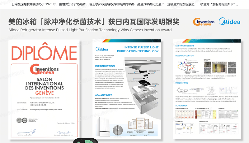 日内瓦国际发明展创办于1973年,由世界知识产权组织、瑞士联邦政府等权威机构共同举办,是全球举办历史最长、规模最大的发明展之一,因其极高的评审标准与广泛的国际影响力,成为全球创新领域极具权威性的赛事,也正是这份严苛的评审体系,让此次美的冰箱获奖更具含金量。此前,该技术已获德国Hygienelabel健康标签,是目前欧洲市场获此认证的中国技术,除此之外该技术更获得中国轻工业联合会“国际优秀”认证,三重国际权威认可奠定了其在食材杀菌保鲜领域的全球优秀地位。