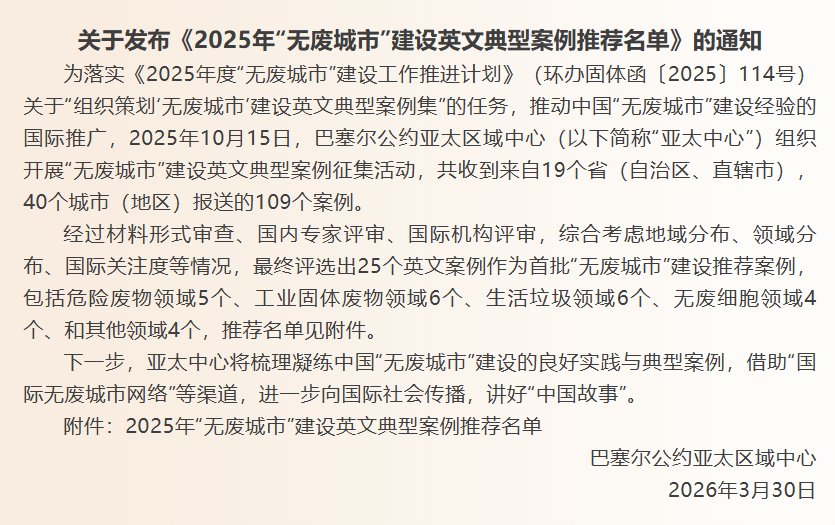 3月30日,巴塞尔公约亚太区域中心(以下简称“亚太中心”)发布《2025年“无废城市”建设英文典型案例推荐名单》,共有25个案例入选。