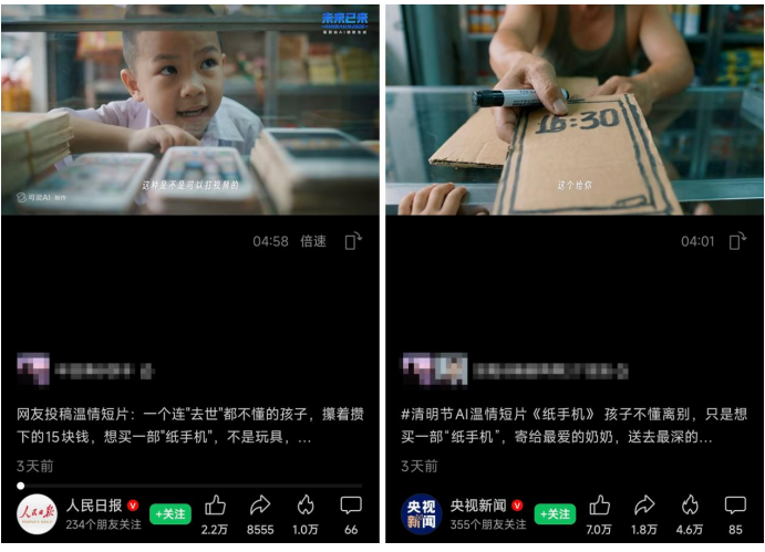 “什么叫去世啊,是不是去一个很远的地方就叫去世啊?”清明节前夕,一支5分钟的AI短片《纸手机》刷爆全网。短短数日,该片播放量破亿,人民日报、央视新闻、新华社等权威媒体纷纷转发,不计其数的网友也在评论区泪崩。有人留下一句精准的评价:“最没人味的AI,制作出了最有人味的短片。”