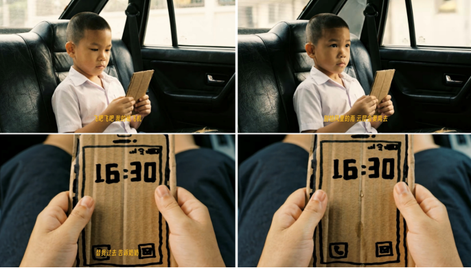 结尾长达一分多钟的车内长镜头,被许多人称赞为“神来之笔”——开往福利院的车上,小男孩静静地捧着“纸手机”,等待永不会响起的电话,伴着AI音乐在纸板手机上落下一滴眼泪。杨选道出了创作逻辑:“亲人的离开往往伴随着长时间的沉默,到一个时间节点才会流泪,这段长时间的沉默,正是中国人的情感内敛的体现。”