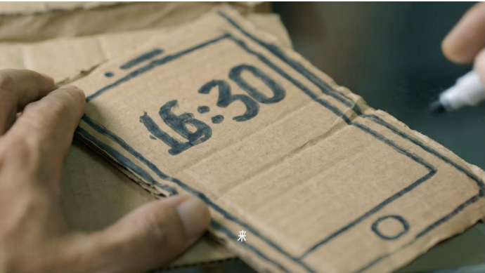 更典型的例子,是短片里唯一没用AI创作的道具——手绘纸片手机。杨选与李婷认为,AI生成结果太精致、太“丝滑”,不符合片中老板的年迈人设。最后,他们将真实道具的照片喂给AI——那个带着深深折痕、笨拙笔迹的纸板手机,藏着市井老人亲手制作的粗糙质感与真切温度,成为全片最为重要的情感锚点。