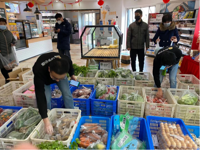助农18条发布后,除了利用线上平台外,苏宁拼购联合苏宁小店、家乐福,将新鲜蔬菜水果源源不断供应社区居民。