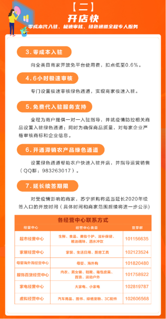 对于还未入驻拼购平台的农户,苏宁拼购向全类目商家开放,免平台使用费,扣点低至0.6%。设有极速审核绿色通道,6小时内完成,实现农户的极速入驻。