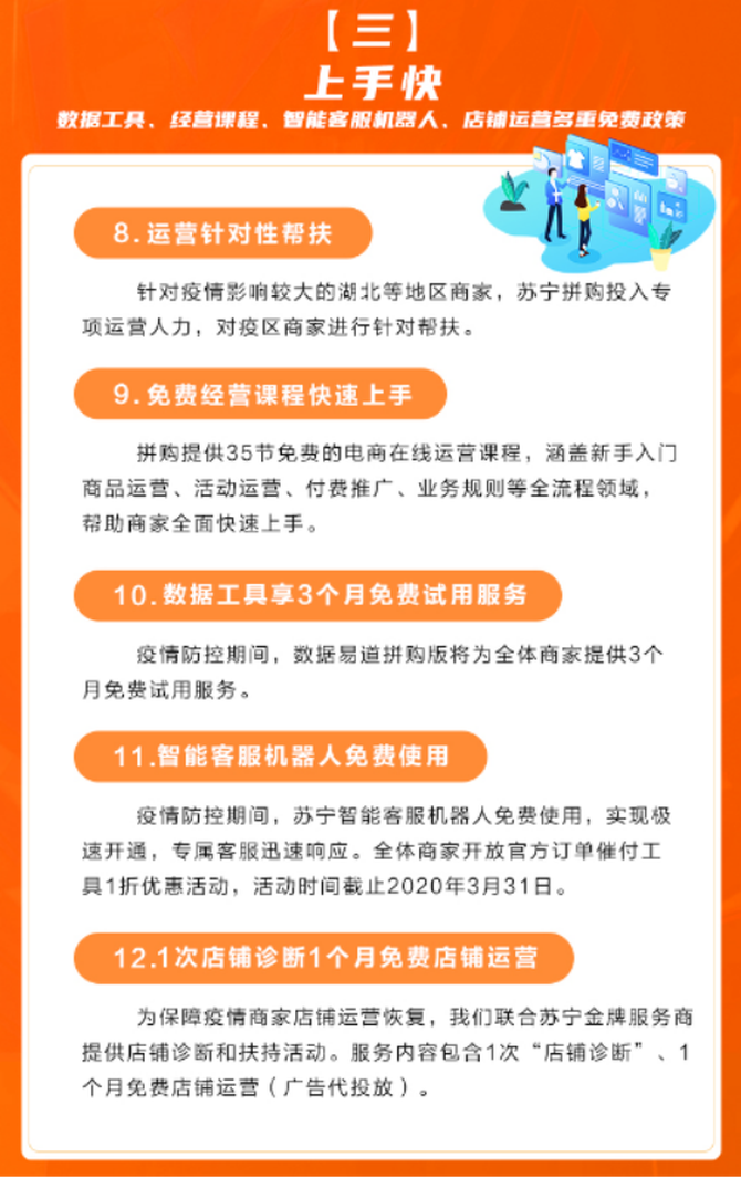 原先收费的数据易道拼购版,将为全体商家提供3个月的免费试用服务、苏宁只能客服机器人免费使用,1次店铺诊断1个月免费店铺运营。