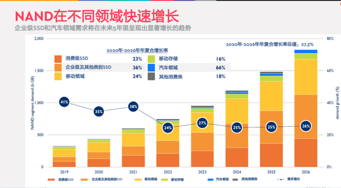 根据权威的Yole调查机构得出结论,目前NAND闪存需求量巨大的还是企业级SSD、消费级SSD,但是近几年来看,汽车领域的NAND需求增速明显更快,根据西部数据公司车载存储产品事业部资深产品市场经理 额日特 Eric先生表示:在2021年,单个手机平均存储容量可以达到105GB,汽车领域实际仅有34GB。然而到了2026年,单车的存储容量达到483GB,而手机只有350GB左右。从数据对比上来看,未来汽车领域的存储会有很大的增长空间。