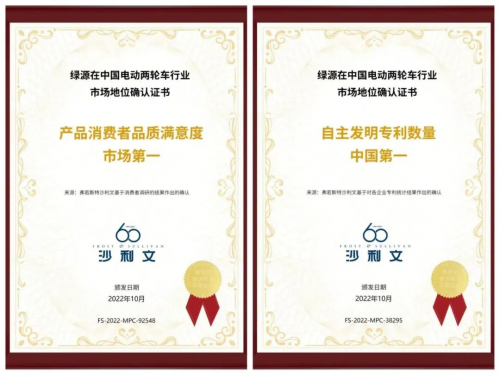 权威认证也接踵而至:中国轻工业联合会连续四年授予绿源科学技术奖项,“液冷集成电机”更是加冕“科学技术发明奖一等奖”;全球增长咨询公司弗若斯特沙利文授予绿源“全球液冷电机开创者”、行业“自主发明专利数量中国知名”、行业“产品消费者品质满意度市场卓越”等多重认证。