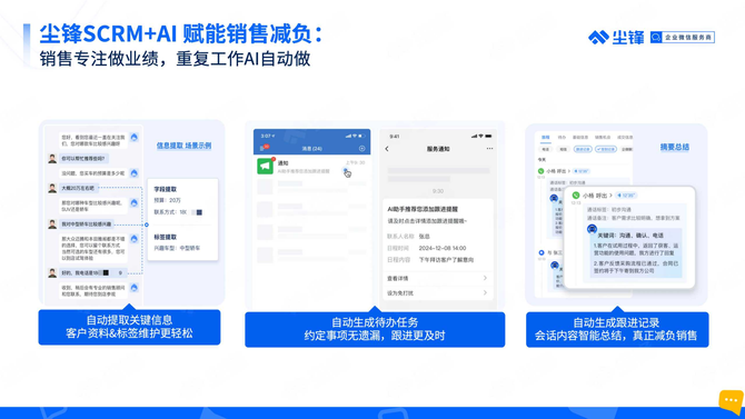 在客户运营上,企业微信能够让转化更高效,通过基于企业微信的尘锋SCRM,不仅可以提高销售转化效率,借助话术库、营销雷达、AI辅助等能力提高跟进效率,还可以使用会话存档全面统计服务沟通情况,帮助管理者追溯服务过程,避免出现回复不及时、过度承诺、私单飞单等违规情况,守护企业的数据安全。