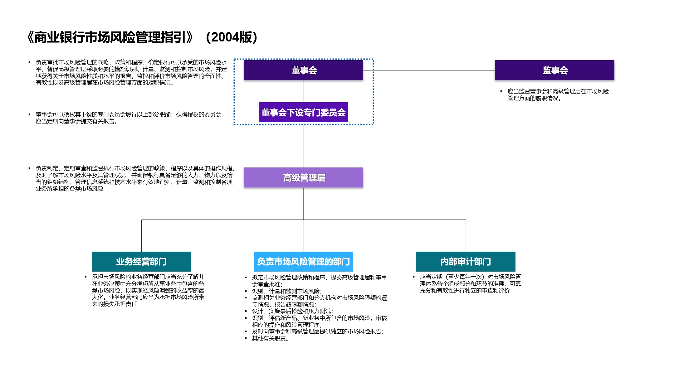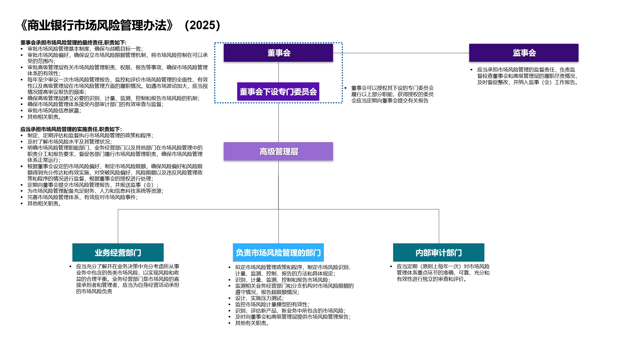 《办法》在原《指引》基础上进一步细化和强化市场风险管理架构,系统梳理了董事会、高级管理层、监事会、执行部门等不同层级的职责边界: