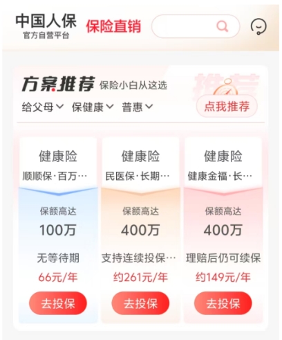 “这个方案推荐功能实在合我心意,可以根据我想要给谁买智能推荐,比如想要给父母买普惠型保险,它就会推荐我民医保长期医疗和个人百万综合意外险等产品,点进去仔细查看保险说明,真的很适合给父母”,据了解,该功能位于人保app保险商城顶端,消费者可根据投保人群、保障类型和产品定位三个维度快速地筛选保险组合,以提升专业保险配置方案的生成效率。投保人群方面细分为「给父母」、「给子女」、「给自己」三个维度,全面覆盖了买保险的三大类人群;保障类型方面涵盖了「健康」、「意外」、「养老」和「财产」四大品类,覆盖绝大多数家庭日常所需;而在产品类型方面,消费者也可以根据自己或者家庭的经济状况和保障需求,在「高端」和「普惠」中作出选择。