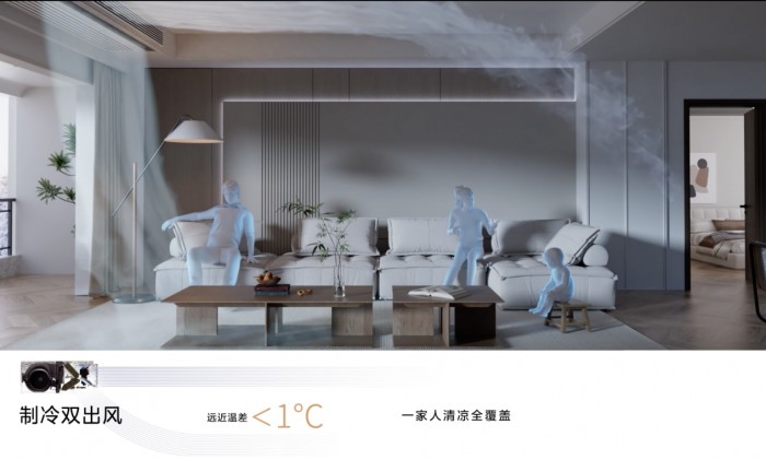 美的领航者Ⅳ采用的双出风室内机是一种新型室内机形式,通过双翼变轨控风技术,可根据不同的使用场景需求调整为上出风、下出风、双出风。在下出风模式下,可将热风送达脚底,制热更舒适;在制冷模式下开启双出风,远近温差<1℃,送风无死角;开启上出风,可以实现14m送风距离,客餐厅全覆盖;并且此内机隐形式安装,无需3D面板即可实现风向调节,兼具美观和舒适性。通过创新设计,实现上下双出风,冷暖双舒适。