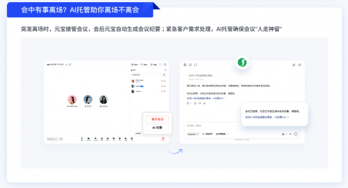 比如职场人小张,每周三下午有两个项目会和一个部门周会撞时间,以前只能请同事帮忙转达,经常漏关键信息。现在用AI托管,三个会的纪要都能轻松拿到,每个会的重点和要做的事都清清楚楚;小张开会中途接到客户紧急电话,让元宝接管后,回来一看纪要,也能知道后续讨论的方案和自己的任务。