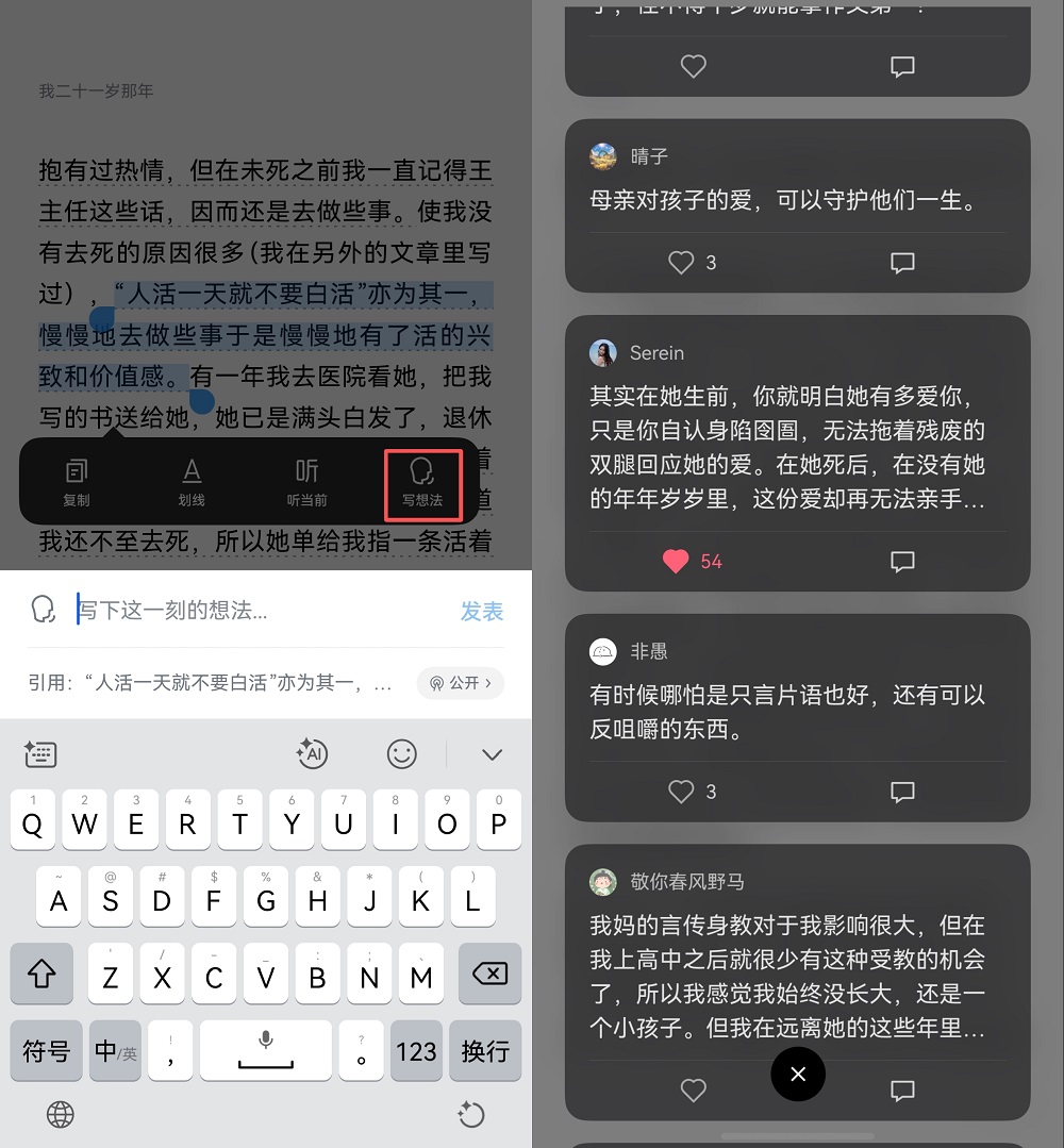 新版本支持用户随时记录“想法”,长按选中内容,点击“写想法”即可快速进入编辑页面,分享自己的想法,同时还能自由设置想法可见范围、删除想法。此外,用户还可点赞他人的想法,增强了读者之间的互动。