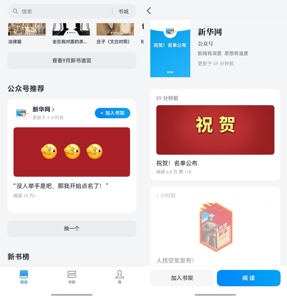 首页新增公众号推荐模块,用户可在应用内直接阅读公众号文章,并将感兴趣的公众号添加到书架,便于及时查看文章更新,同时支持内容分享,提供一站式公众号阅读服务。