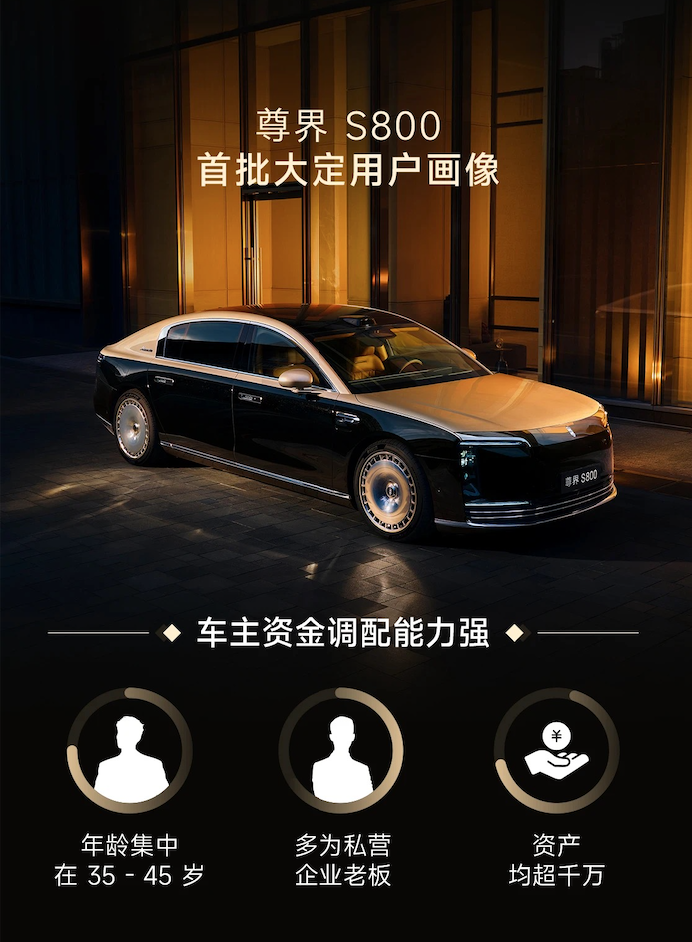 商务出行时,华为乾崑智驾ADS 4驾驶辅助系统以低反应延时完成变道避险,减轻驾驶疲劳;家庭出行中,后排双零重力座椅搭配智能巨幕投影,提升长途舒适感;私人休憩时,星空顶、隐私光幕和独立音区营造私密空间。尊界S800车主以35至45岁企业家与民营高管为主,他们愿为提升生活品质的体验付费,这是其立足百万级市场的关键。而14000台大定海报上的数字,正是年轻富豪对体验型豪华认可的非常好的证明。