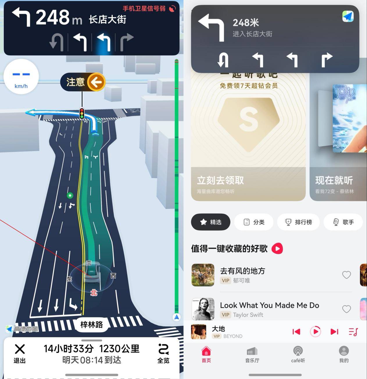 自驾可以说是我最最常用的场景,由于对大部分路线都比较熟悉,所以我手机基本上都会停在音乐界面,高德地图放在后台就够了,偶尔遇到复杂路线只需要快速扫一眼状态栏就知道该怎么走,不用切换应用查看,特别省事。它的实况窗在导航时仅展示关键信息,如车道指引、路口距离等,路况信息一目了然,既不影响听歌心情,又避免信息过载干扰驾驶,长途出行更加轻松。