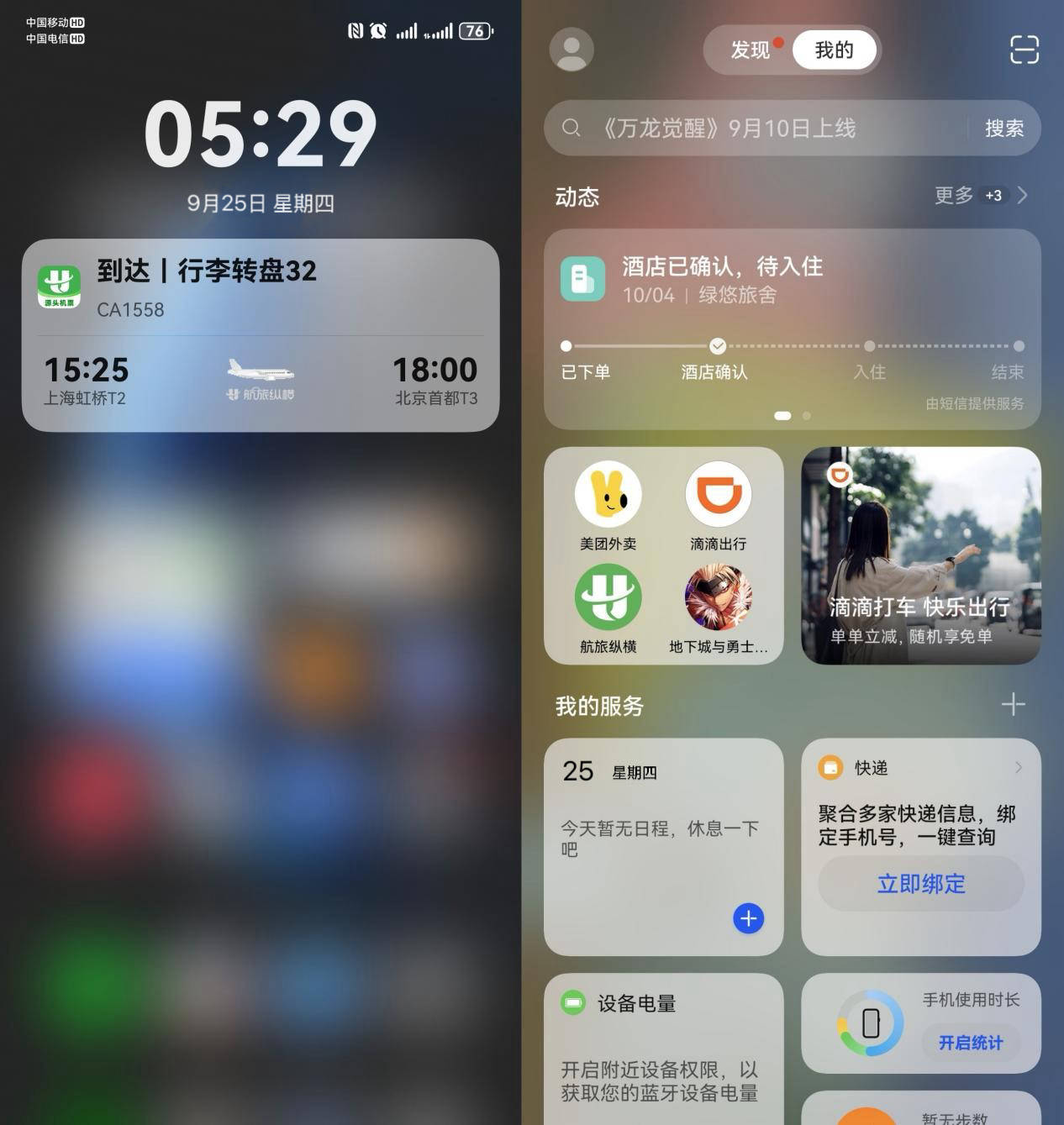 由于工作性质,我们会经常出差参加发布会和拍摄内容,自从去年使用鸿蒙5一直到现在,我出行的质量呈指数上升,很多关键信息都会针对性推送,并从实况窗、锁屏等位置获取,如今在解锁界面就能看到航班号、登机口等关键信息。即使因为天气、流量控制等问题延误或者更改登机口,也能第一时间掌握。更贴心的是,落地后行李转盘号也会第一时间弹出,彻底告别拿着大包小包在屏幕前“盲找”转盘的尴尬,还有酒店等信息也会在负一屏动态中呈现,临近入住时间也会在实况窗中提醒,从起飞到落地,每一步都有提醒,全程更加从容有序,省心省力。