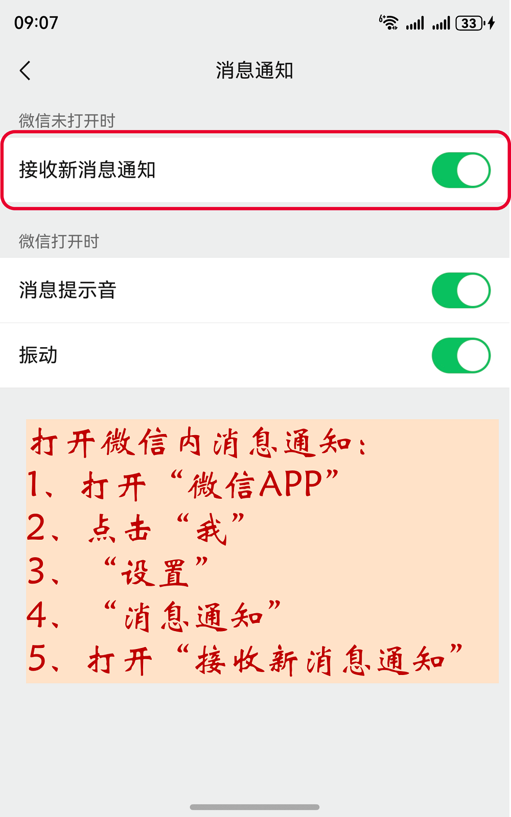 • Step2——微信内部通知别忘开!打开微信App,依次点击右下角“我”-“设置”-“消息通知”,打开“接收新消息通知”。