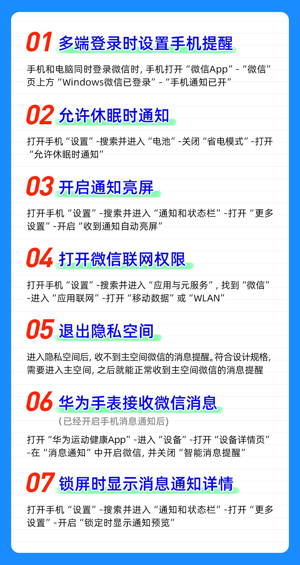 若完成上述设置后问题仍未解决,还有多种“大招”——多端登录时设置手机提醒、允许休眠时通知、开启通知亮屏、打开微信联网权限、退出隐私空间、华为手表接收微信消息、锁屏时显示消息通知详情等,可以对照下图检查一下~