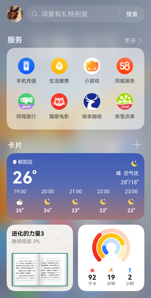 此外,华为负一屏还支持用户自定义服务宫格区,可根据个人需求添加酒店预订、看剧、查旅行攻略等元服务。还为天气、阅读、运动健康等服务定制了专属的个性化卡片,将用户需要聚合在这一屏。