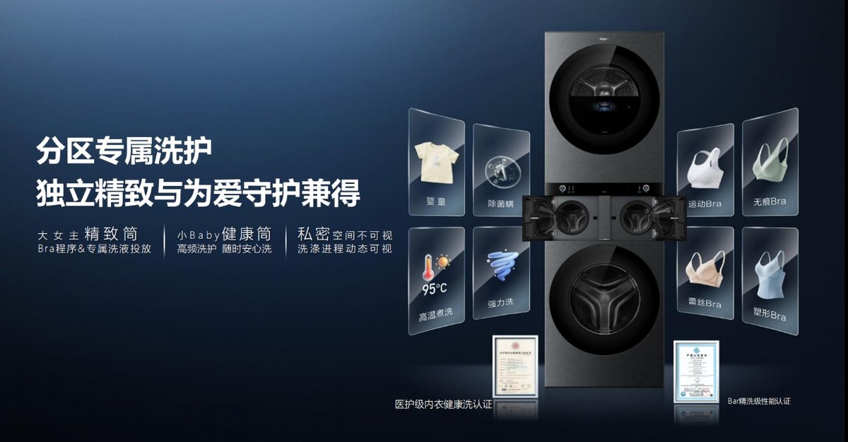 而当真正使用融合·洗护家时,才会理解“一机四筒、分区洗护”的真正含义。海尔融合·洗护家并非简单地将四个筒叠加,而是做到“专筒专程序”的专业洗烘呵护。10KG洗衣主筒搭载AI直驱洁净科技,精控每1°洁净不伤衣;10KG独立烘干大筒创新AI双擎全变频科技,45分钟高效烘干4KG衣物;右侧1KG小筒专为内衣设计,获Bra精洗级认证;左侧1KG健康筒获得医护级健康洗认证,宝宝衣物随时安心洗。全家人的衣物,从此可以实现同步分筒专业洗烘护。
