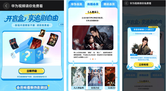 另外,我还发现了一个隐藏福利。如果你也是华为视频的新用户,只要对小艺说出口令“我要追剧自由”,就可以跳转到一个开盲盒的活动页面,有机会获得华为影视、优酷或腾讯会员,而且是100%有奖!真是天大的羊毛!