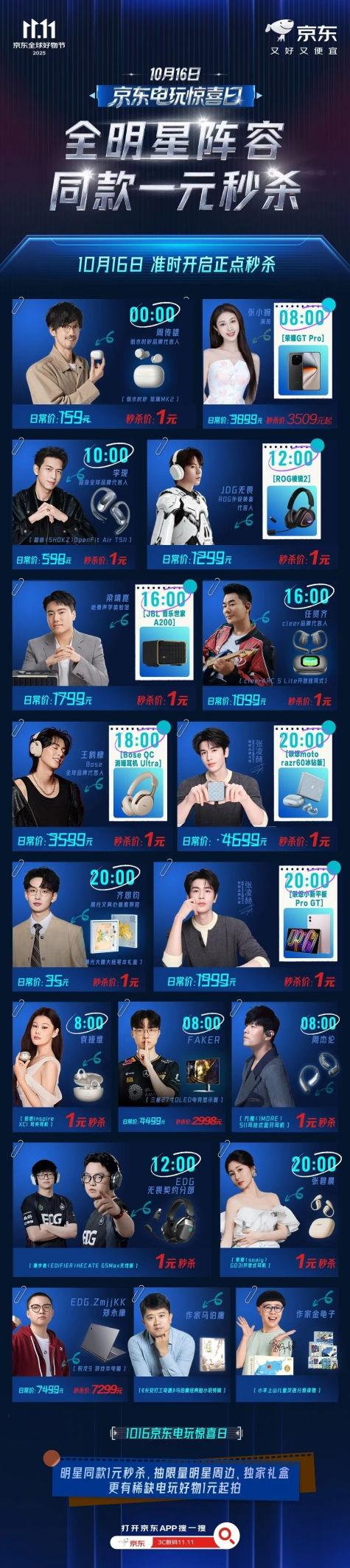 在京东11.11电玩惊喜日当天,京东秒杀频道联合京东3C数码事业群,聚焦明星代言热门单品,在10月16日0点至22点多个时段推出明星同款1元秒杀活动,其中多款单品上线即秒空,引发用户抢购热潮。在10月16日16点,1元即可秒杀哈曼声学体验官梁靖崑推荐的JBL音乐世家A200,在客厅感受音乐的细腻;18点,1元抢BoseQuietComfort Ultra消噪耳机,像其代言人王鹤棣一样窝在沙发里享受放松时刻;20点,联想品牌大使张凌赫推荐的小新平板ProGT也将1元秒杀。