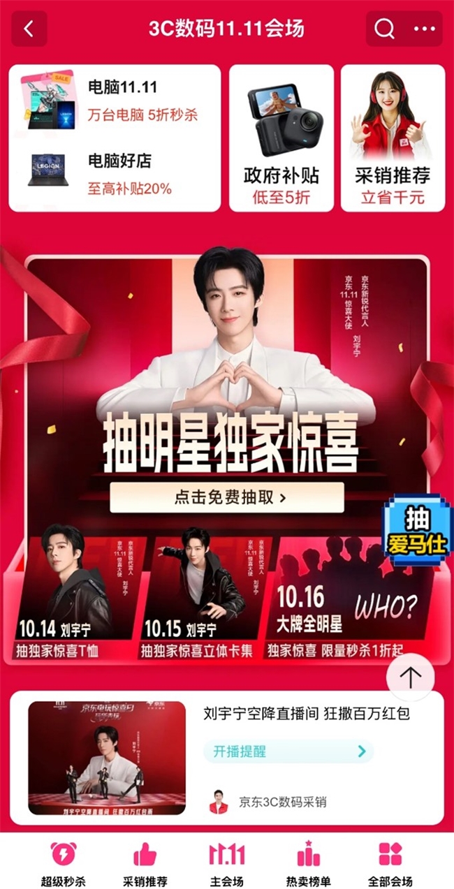 除此之外,京东3C数码也为刘宇宁的粉丝们带来了较多趣味玩法。中午12点,3C数码采销直播间将开启12小时不断播、百万红包雨撒不停。京东新锐代言人11.11惊喜大使刘宇宁也将在10月16日下午16:00空降直播间,与京东青春采销带来才艺展示,并不定时抽出3C数码大礼包,更有神秘男团出道成团,明星同款好物1元拍卖。