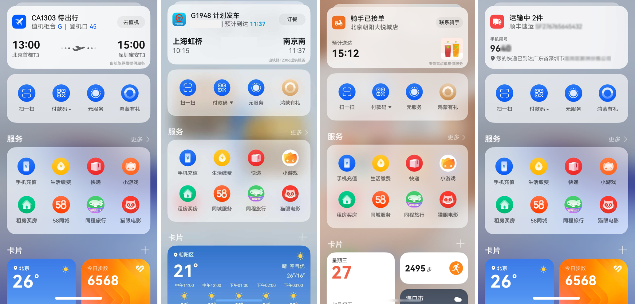 告别频繁打开App!只需在负一屏“动态管理”中开启12306、航旅纵横等服务动态,航班车次、检票口等信息即可实时跟踪,桌面右滑一下优雅出发。此外,动态服务卡片还能添加诸如外卖、快递等各类生活服务,双十一已经开始,开启快递卡片助你轻松掌握快递动态,省钱更省心。