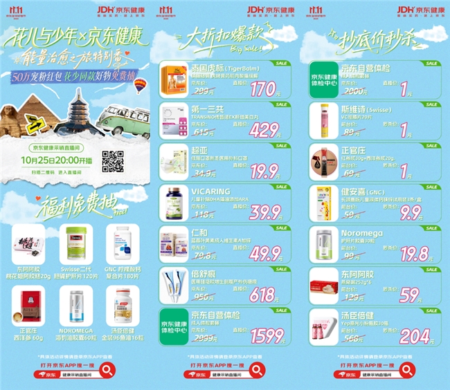 10月25日,锁定京东健康采销直播间,参与明星互动、1元试用、1元起拍,解锁健康好物与旅行福利,开启一场兼具治愈感与性价比的消费之旅!