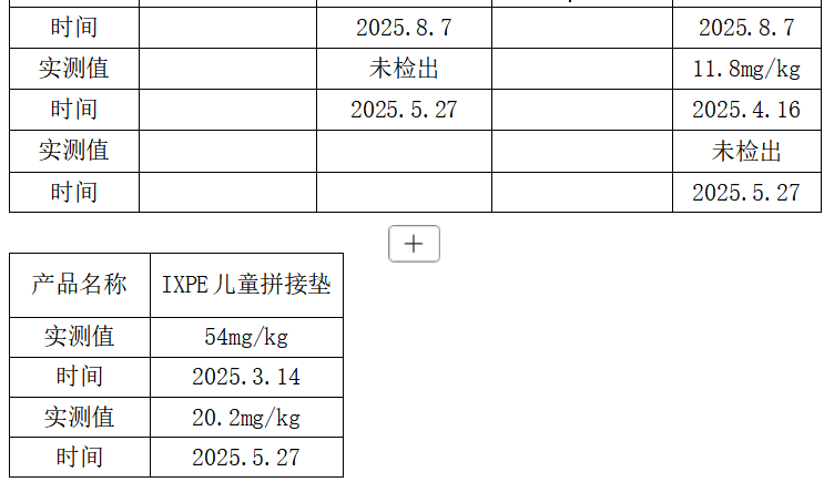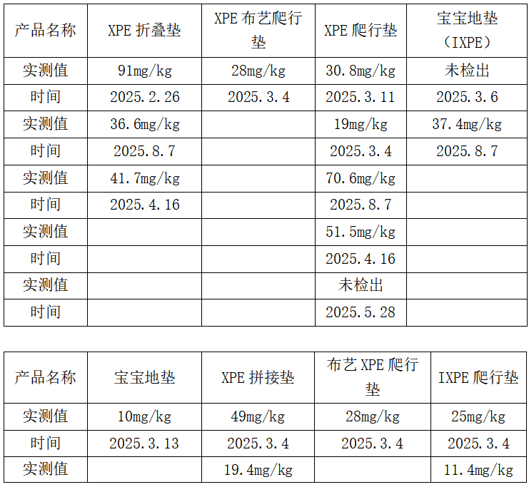 曼龙,第二季度分别对XPE折叠垫(2025年4月16日,甲酰胺实测值41.7mg/kg)、XPE爬行垫(2025年4月16日,甲酰胺实测值51.5mg/kg)、XPE拼接垫(2025年5月27日,甲酰胺未检出)、IXPE爬行垫(2025年4月16日,甲酰胺实测值11.8mg/kg)、IXPE儿童拼接垫(2025年5月27日,甲酰胺实测值20.2mg/kg)进行了甲酰胺检测,均符合国标,并且≤100mg/kg。