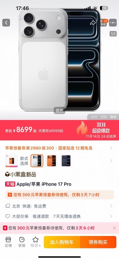 综上所述,在京东300元惊喜券、700元以旧换新补贴的双重优惠加持下,果粉们可以在京东买到更加便宜的iPhone 17 Pro系列。已经心动的果粉,现在就可以打开京东APP搜索“苹果惊喜券”,直接领券享全网超值价格,错过这波优惠,就只能等明年了!
