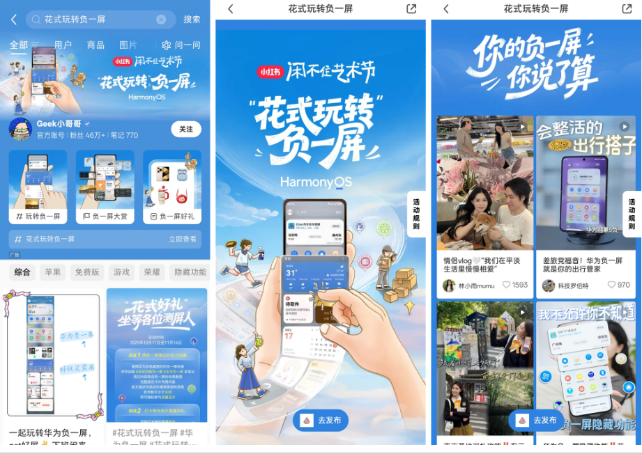 从智慧出行、高效办公再到休闲生活,华为负一屏以丰富且实用的日常高频服务、“千人千屏”的精美个性化布局,成为用户生活中的好帮手。尚未参与的花粉们速速加入这场创意比拼,前往小红书秀出你的专属负一屏布局,抢占收官福利末班车!